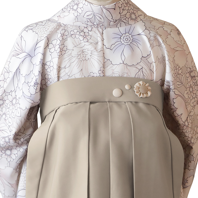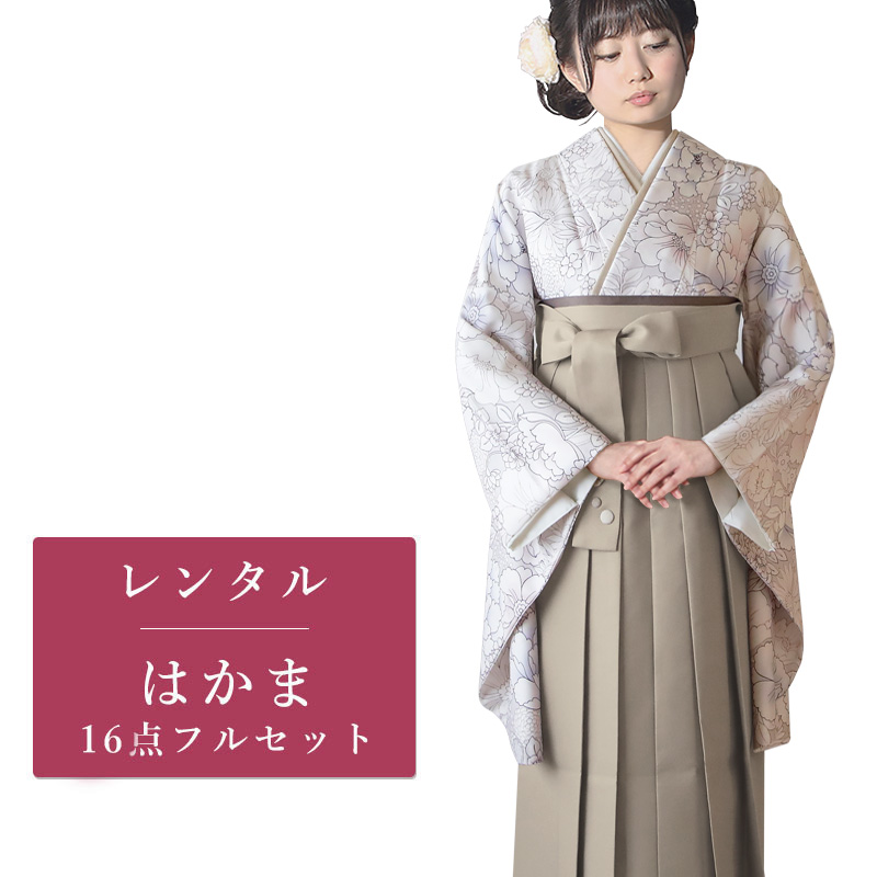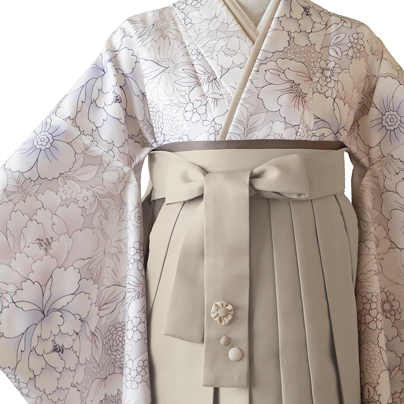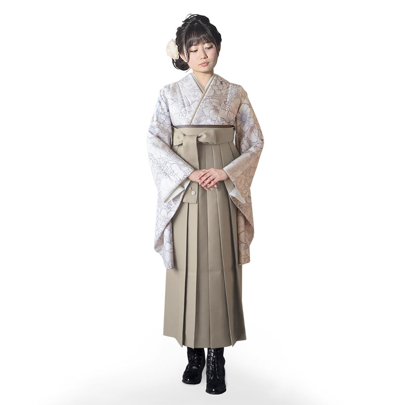 女の子の卒業式のお祝いにぴったりのレンタル着物と袴セットです。トレンド感のあるデザインでグレー花柄のお着物となります。