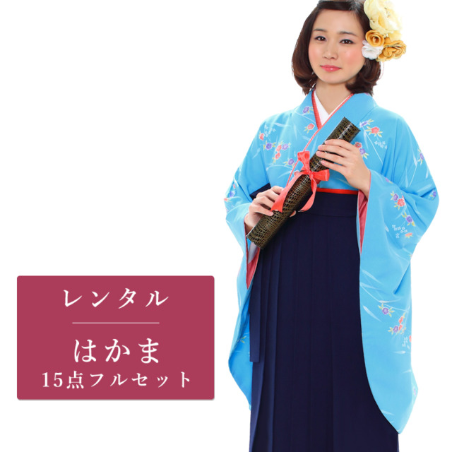 卒業式 着物 袴 15点セット 二尺袖 卒業袴 ブルー 無地|花紋 g162